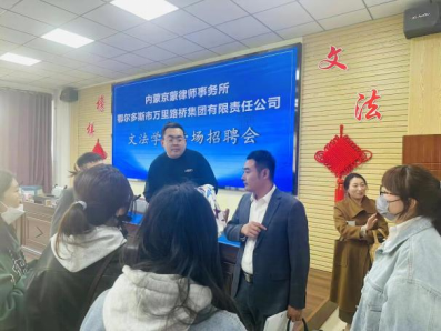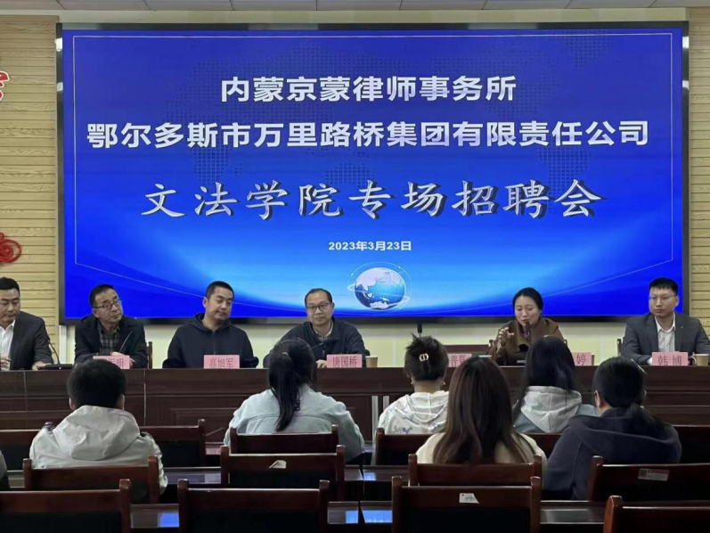 2023年3月23日下午,内蒙京蒙律师事务所和鄂尔多斯市万里路桥集团有限责任公司应邀在明德楼东A411举办法学、汉语言文学、和秘书专业的专场招聘会。内蒙京蒙律师事务所主任段普复、执业律师韩博,鄂尔多斯市万里路桥集团有限责任公司常务副总乔婷、经营副总高旭军一行到访鉴黄师