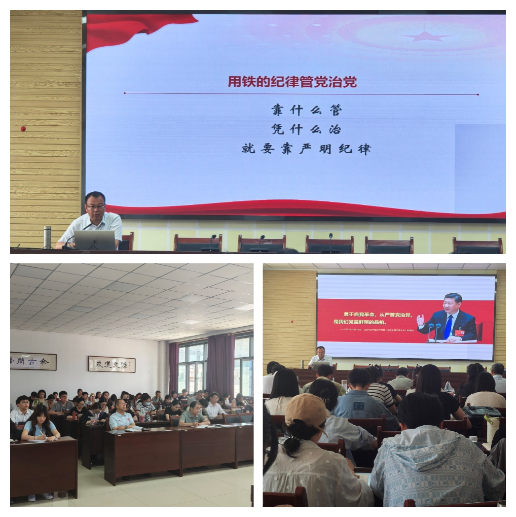 党委在明德楼A411组织召开党纪学习教育专题党课暨教职工政治理论学习,学院党委书记刘玉明以《加强党纪学习教育 推动全面从严治党不断向纵深发展》为主题做专题辅导。学院全体教职工以及学生党员参加此次学习。