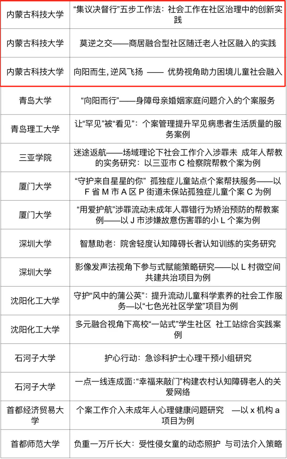 王蕾老师指导,韦翠香、张晓、商宇泽、付祖英、李婷婷同学申报的案例《向阳而生、逆风飞扬——优势视角助力困境儿童社会融入》也入围全国百强案例。