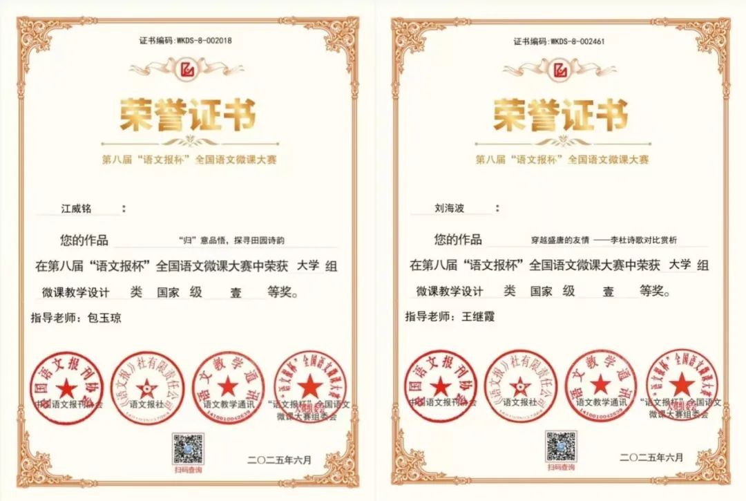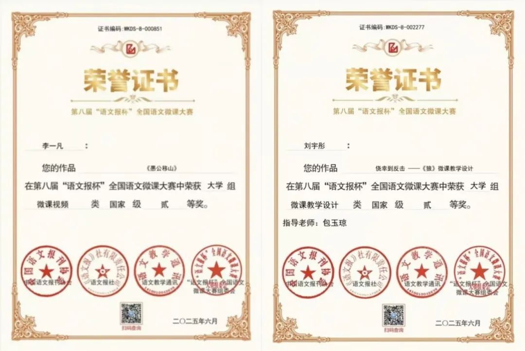 学科教学(语文)硕士教育中心学子凭借扎实的专业素养和出色的教学实践能力脱颖而出,斩获多项国家级奖项:江威铭、刘海波荣获微课教学设计类国家级一等奖,刘宇彤获微课教学设计类国家级二等奖,李一凡获微课视频类国家级二等奖。