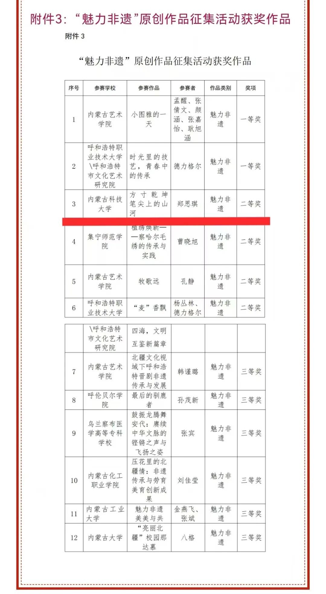 由王晓敏老师指导,郑思琪、张文泽、刘蕾、李欣然、康姝婷、张博雅、翟鲁凯等同学报送的非遗主题原创作品《方寸乾坤·笔尖上的山河》凭借独特文化视角与精良制作,从全区众多参赛作品中脱颖而出,荣获“魅力非遗”原创作品“二等奖”。