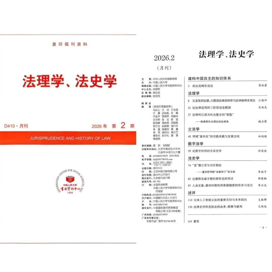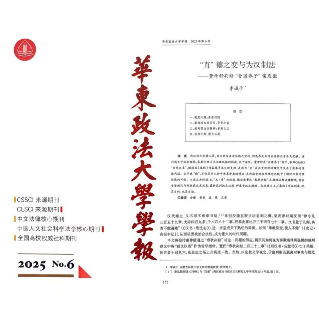 法学系李诚予副教授的学术论文《“直”德之变与为汉制法——董仲舒判断“舍匿养子”案发微》获中国人民大学复印报刊资料《法理学、法史学》2026年第2期全文转载。该论文原刊发于《华东政法大学学报》2025年第6期。