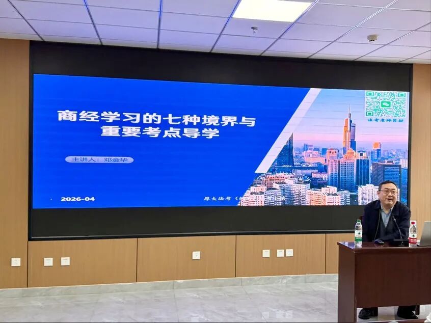 讲座以“商经学习的七种境界与重要考点导学”为主题,邓金华老师以古典诗词为引,将商经法学习拆解为“独上高楼—区分”“为伊憔悴—顺位”“庐山烟雨—回归”等七大境界,用生动易懂的方式拆解复杂法条与考点逻辑。同时,他围绕商法五大基本原则等核心内容,结合法考命题趋势,系统梳理了商经法的备考重点、学习方法与时间规划,既传授了区分思维、顺位思维、回归思维等应试技巧,也分享了在学习中探寻乐趣的心得,为同学们搭建了清晰的备考框架,破解了备考迷茫。