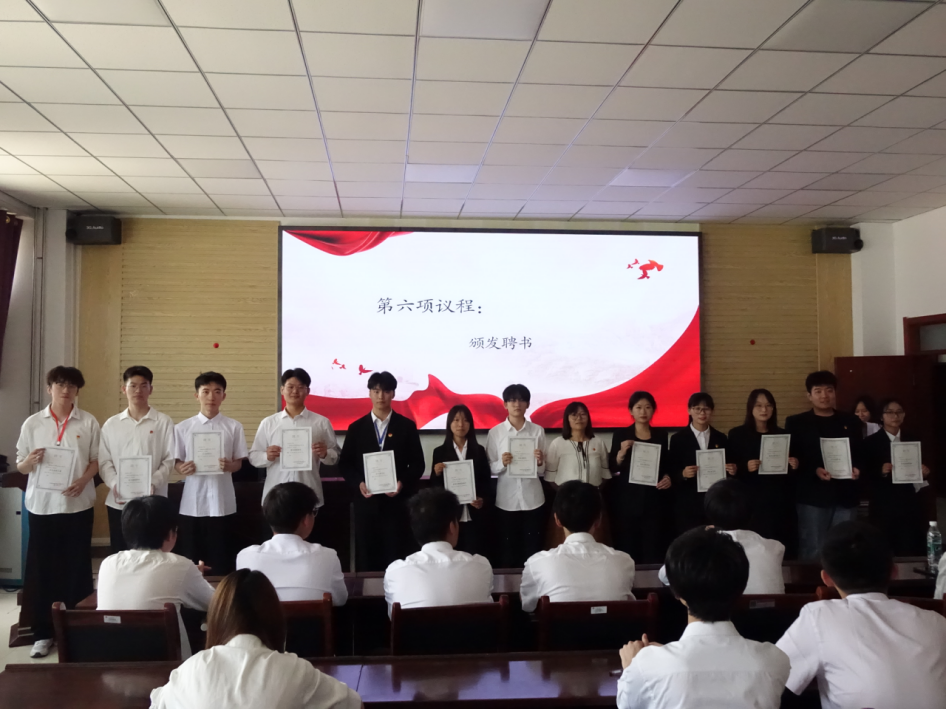 第十三届团总支·学生会学生干部颁发了聘书并为本次大会做总结讲话。提出作为学生干部应该具有政治意识、担当意识、服务意识。最后对第十三届团总支学生会全体成员的努力提出表扬以及对十四届团总支学生会工作给予更高期许,希望文法学生会继续发扬光大。