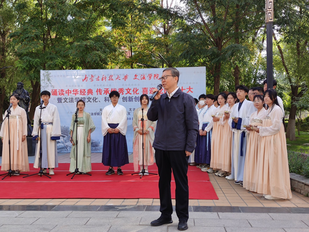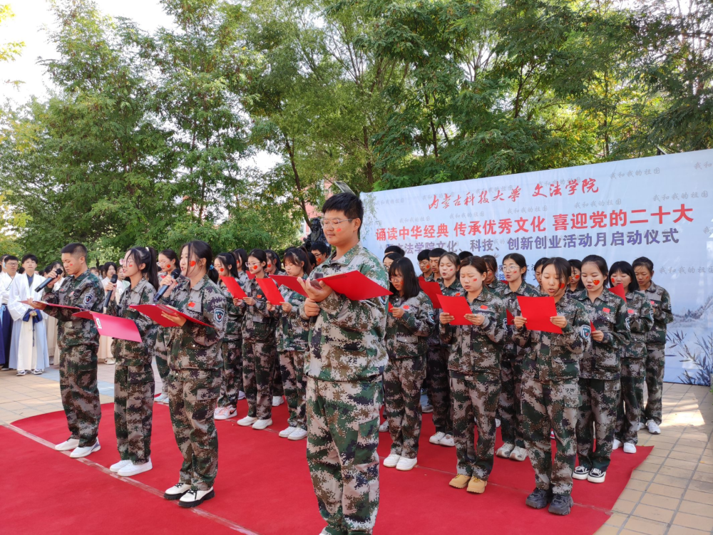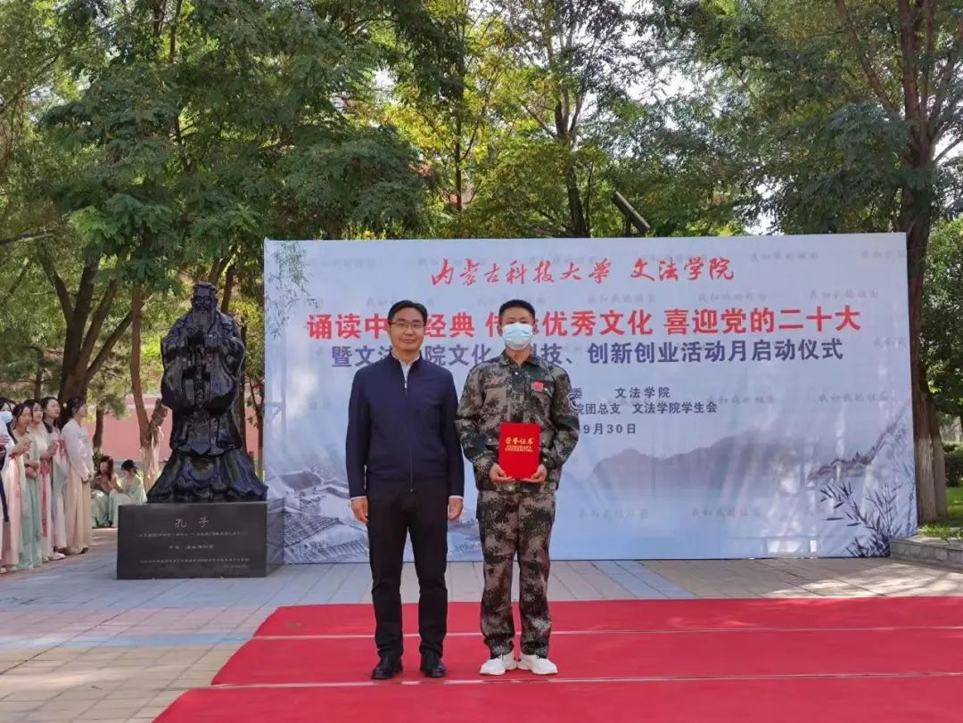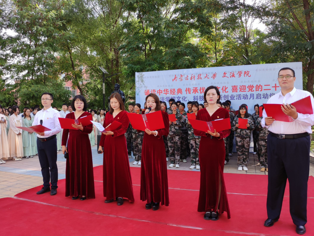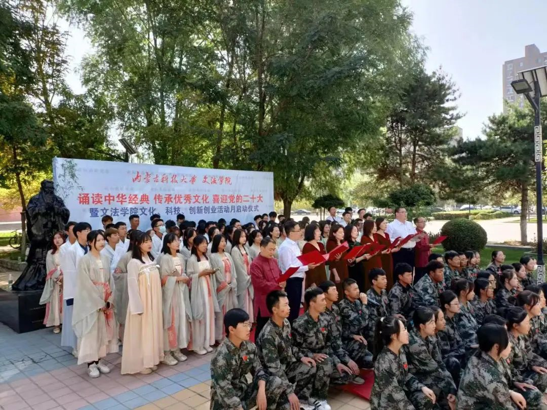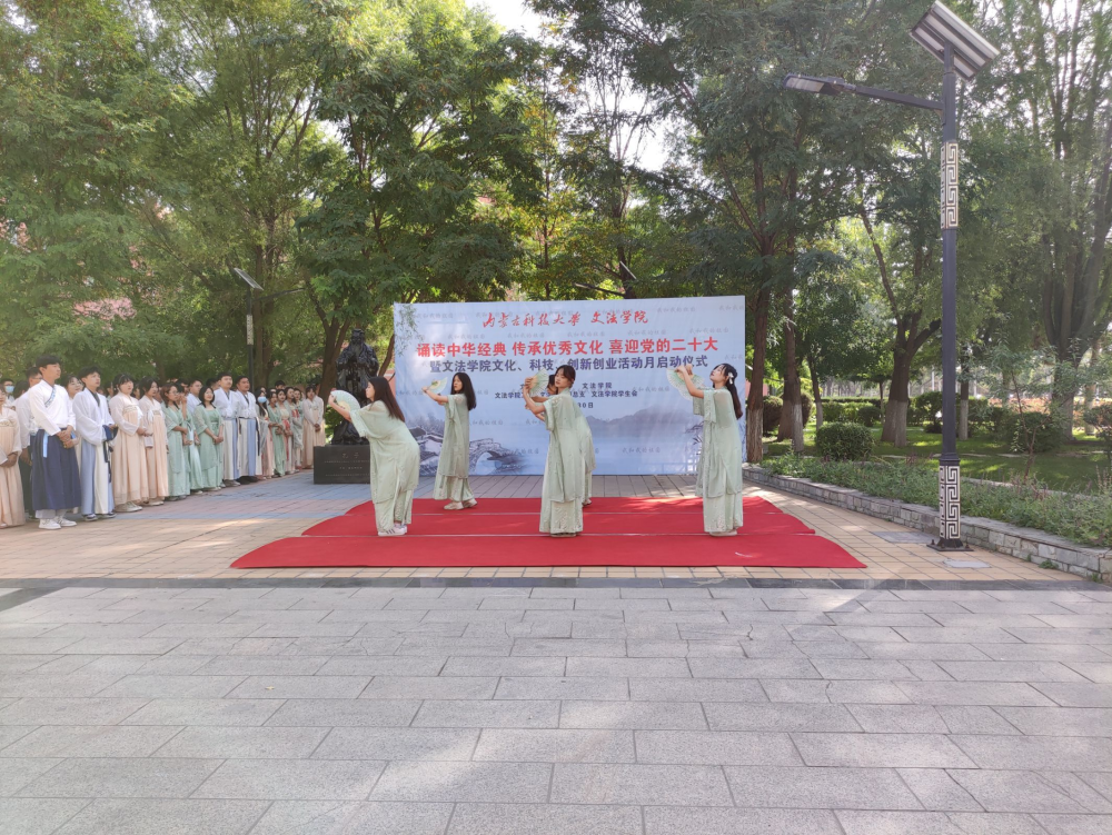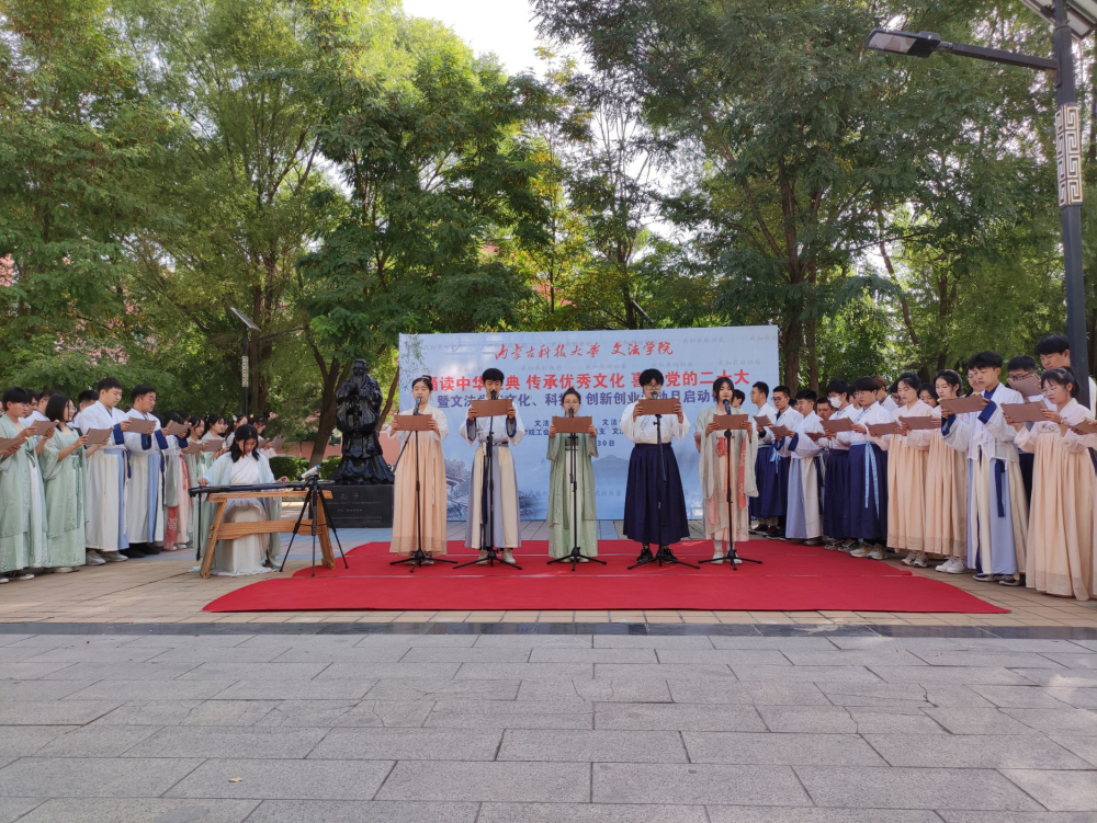 、学院工会、团总支和学生会联合,于2022年9月30日上午在秋实楼广场校友捐赠的孔子像前举办“诵读中华经典 传承优秀文化 喜迎党的二十大暨文化、科技、创新创业活动月启动仪式。”本次活动总共分为四个篇章:第一篇章:诵读中华经典,传承优秀文化。第二篇章:文化、科技、创新创业活动月启动仪式。第三篇章:我和我的祖国。第四篇章:喜迎党的二十大。