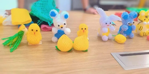 本科生第一党支部的大学生带领小学生们将泡沫网变废为宝,制作成有趣的手工制品,赋予其新的灵魂。此环节源于我们之前在社区举办活动时,发现了一位宝藏老奶奶,这位老奶奶赴蔬菜市场将水果店废弃的泡沫网带回家,研究制作了很多小摆件,我们向老奶奶学习了制作小手工的过程,从中不仅体会到制作手工的过程,还懂得了废弃物品循环利用的真谛。