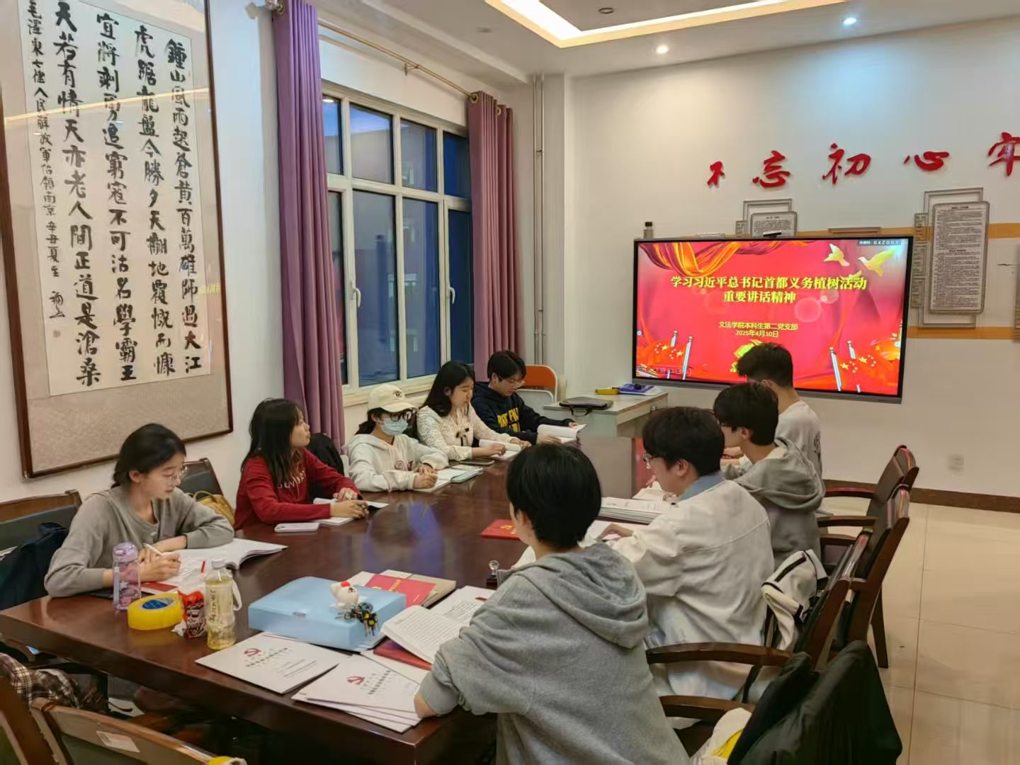 本科生第二党支部在明德楼A308开展“学习习近平总书记首都义务植树活动重要讲话精神”理论学习,此次理论学习旨在提高支部党员的生态保护意识,明确未来生态保护行动方向。