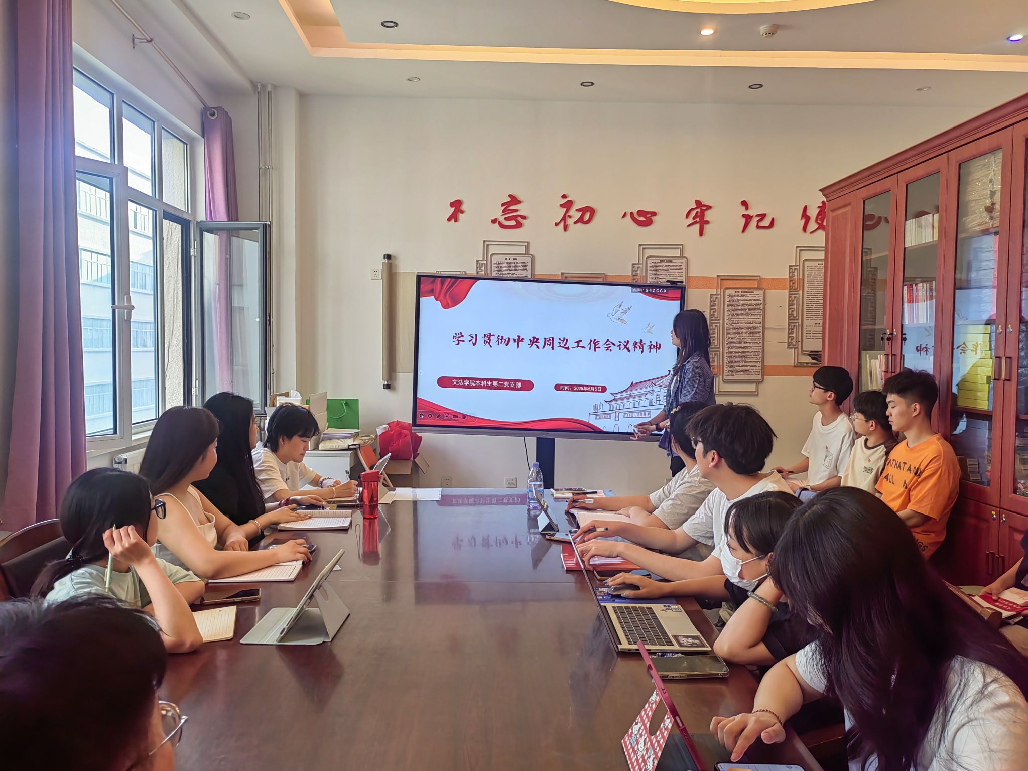 本科生第二党支部于2025年6月5日在明德楼A308开展“学习贯彻中央周边工作会议精神”理论学习活动。会议由党员刘佳璐主持,通过PPT教学、视频学习与交流讨论等形式,展开深入研讨。