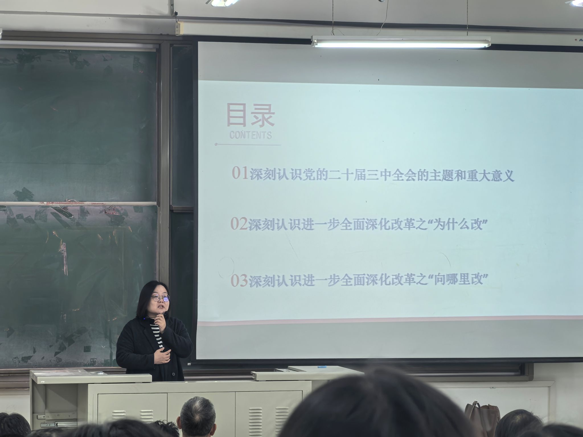 活动伊始,宣讲人付春华老师围绕党的二十届三中全会的主要内容和精神实质,从三个方面进行了深入浅出的讲解:一是深刻认识党的二十届三中全会的主题和重大意义;二是深刻认识进一步全面深化改革之“为什么改”;三是深刻认识进一步全面深化改革之“向哪里改”。