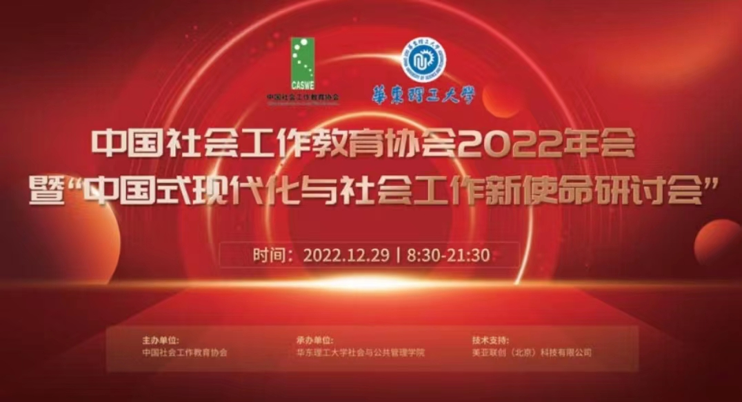 2022年12月29日-30日,中国社会工作教育协会2022学术年会暨“中国式现代化与社会工作新使命研讨会”在线上举行,本次大会由中国社会工作教育协会主办,华东理工大学社会与公共管理学院承办。协会名誉会长王思斌教授、原副会长陆士桢教授、常务副会长关信平教授、副会长兼秘书长马凤芝教授、副会长顾东辉教授、陈树强教授、彭华民教授、张和清教授等领导出席并作了主题发言。社会工作硕士(MSW)教育中心研究生黄娟秀投稿并参会。