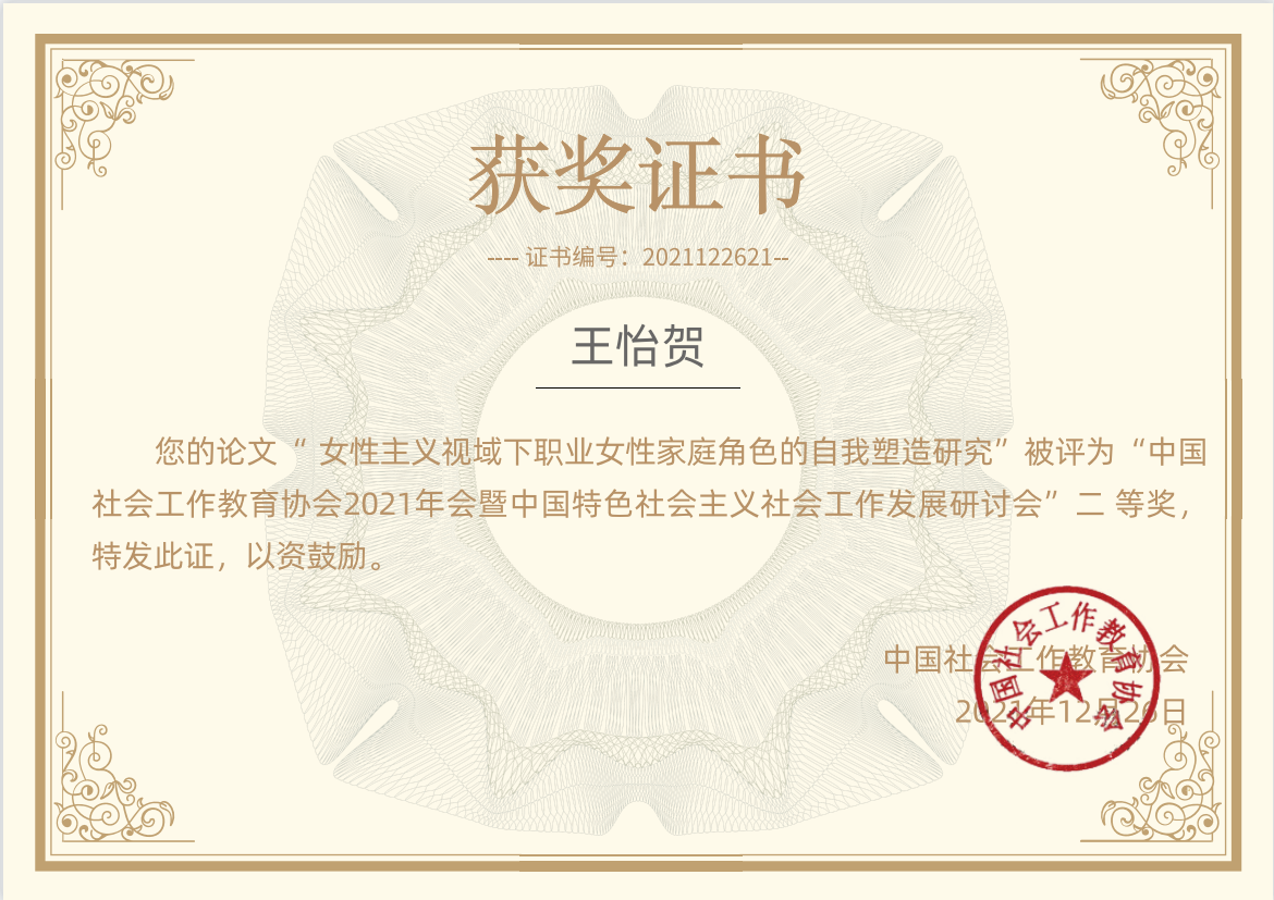 2021级社会工作硕士研究生王怡贺同学获得中国社会工作教育协会2021年会暨“中国特色社会主义社会工作发展探讨会”优秀论文二等奖。