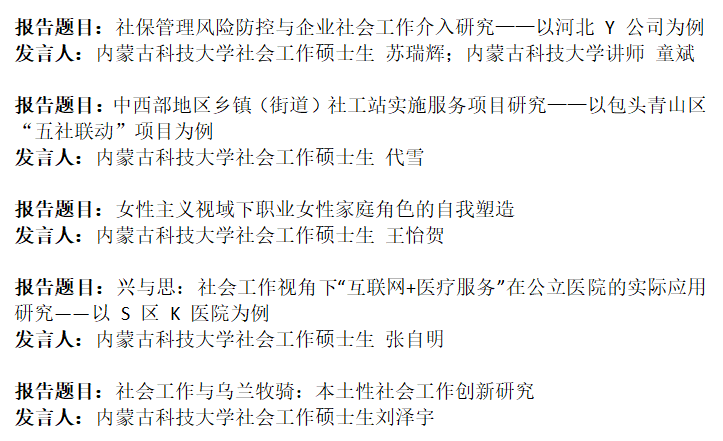 社会学系童斌博士,社会工作硕士研究生王怡贺、陈李红、代雪、张自明、苏瑞辉、刘泽宇同学参会。