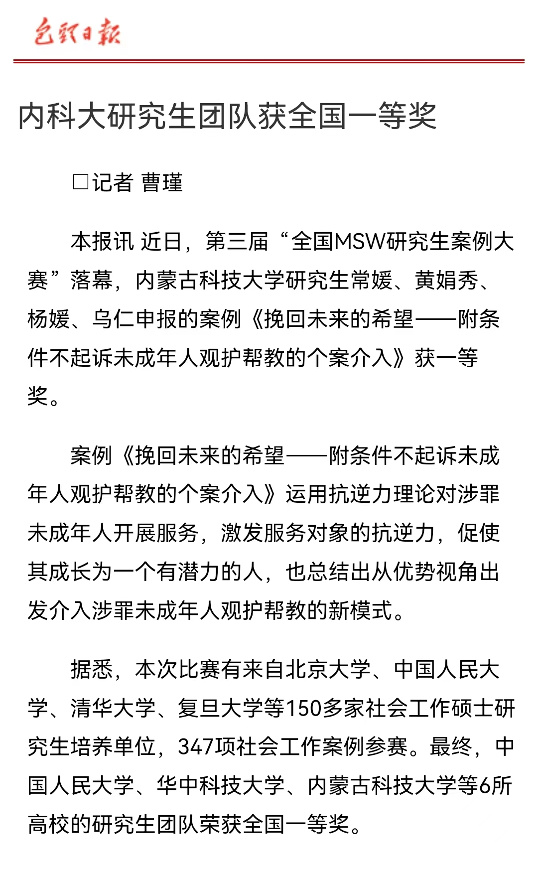 由鉴黄师 鉴黄师 侯荣庭副教授指导,研究生常媛、黄娟秀、杨媛、乌仁申报的案例《挽回未来的希望——附条件不起诉未成年人观护帮教的个案介入》获第三届“全国MSW研究生案例大赛”全国一等奖,并被包头日报转载报道。