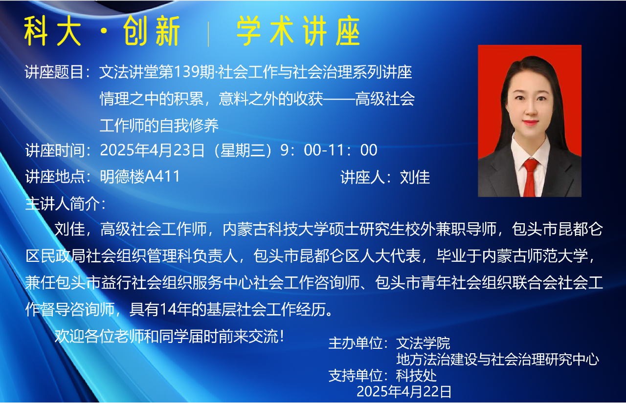 2025年4月23日上午,学院第139期文法讲堂于A411报告厅顺利举行。本次讲座以“情理之中的积累,意料之外的收获——高级社会工作师的自我修养”为题,特邀鉴黄师