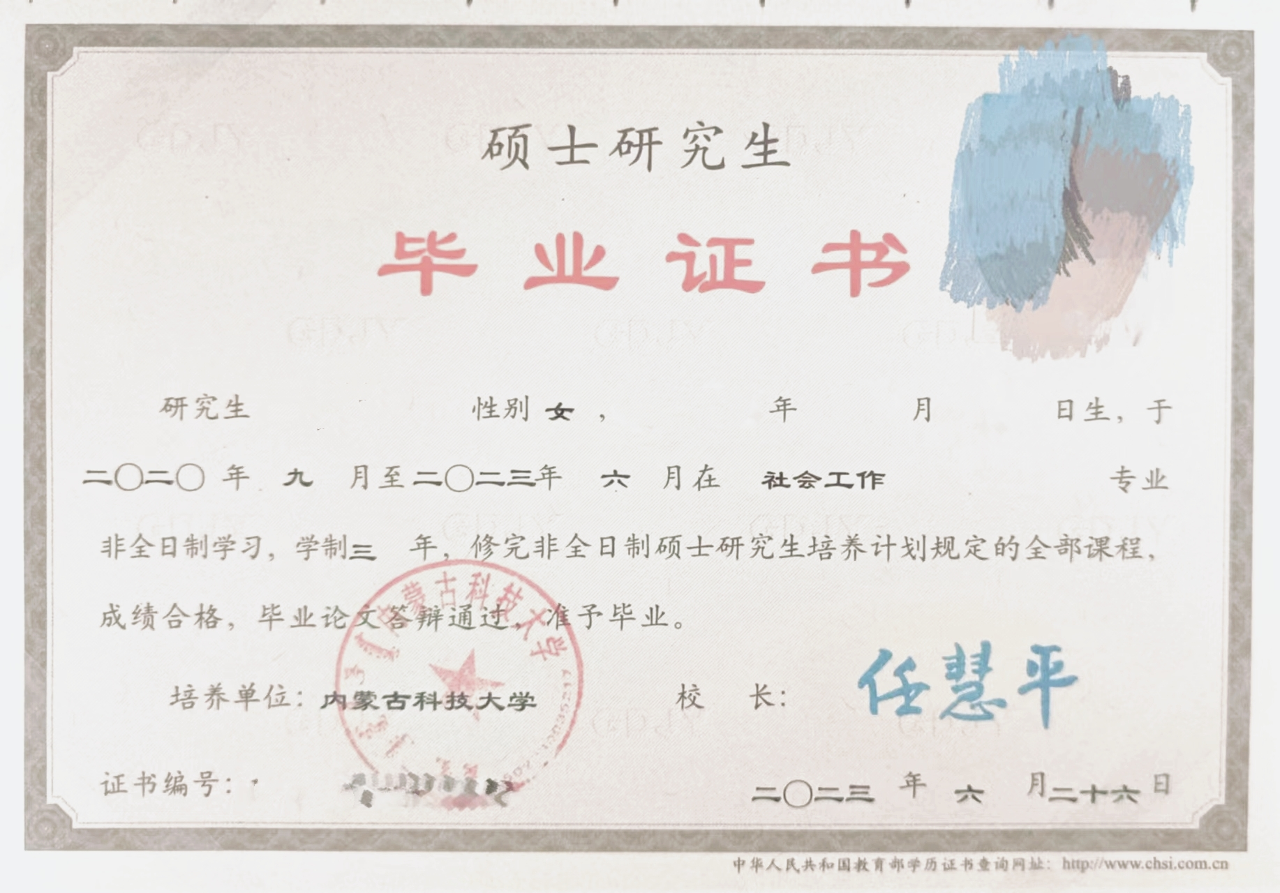 授予教育部认定的社会工作硕士研究生毕业证书和学位证书。