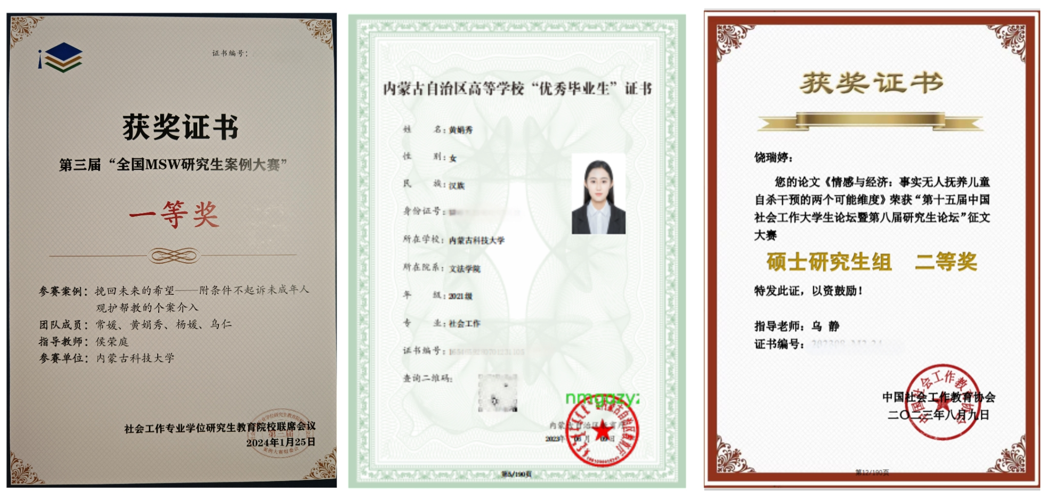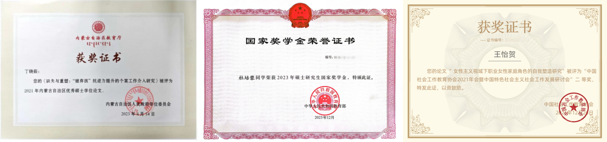 自学位点成立以来,研究生的专业能力和学术成果也在不断丰富涌现。截止2024年9月,研究生取得高级社会工作师资格2人,取得中级社会工作师和助理社会工作师资格数十人。发表学术论文和会议论文三十余篇,获自治区优秀硕士论文2篇,校级优秀论文7篇,荣获全国MSW研究生案例大赛一等奖1项,优秀奖1项,研究案例荣获第三届社会工作专业服务“全国百优案例”,会议论文荣获中国社会工作教育协会学术年会二等奖4项,三等奖6项。
