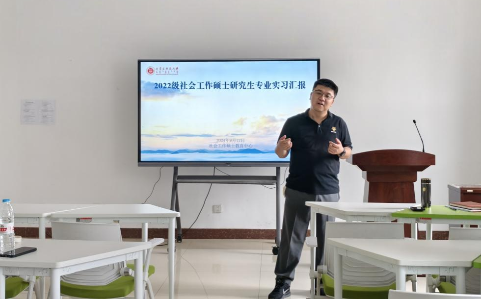 社会工作硕士教育中心于明德楼A302举行2022级硕士研究生专业实习汇报会。本次汇报会由社会工作硕士教育中心副主任侯荣庭副教授主持,许晓芸副教授、乌静副教授、孙秀丽副教授、研究生党支部书记王蕾博士、那木拉博士以及2022级全体硕士研究生共同参加。